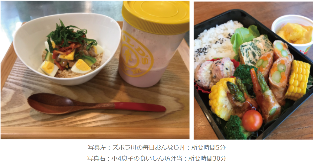 コロナ禍の在宅期間中には、当時小学校4年生だった息子さんのためにボリュームたっぷりなお弁当を用意。愛情がたくさんつまっています!ご自身のテレワークランチも、所要時間なんと5分で作っていたものの見た目もカラフルで超ヘルシーそうです。プロテインをキチンと飲んでいるところもすごい!