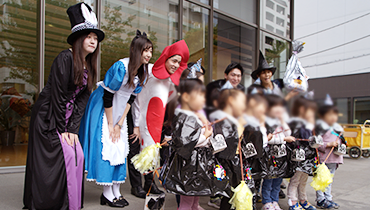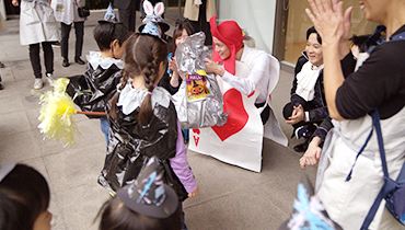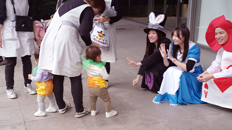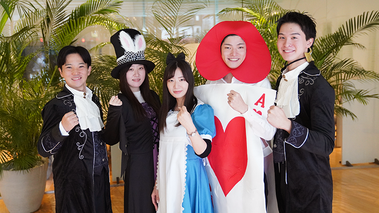 お迎えするアシスト側も、すっかり入社1年目メンバーのお仕事として定着しつつあり、今年は「不思議の国のアリス」の装いで、お菓子をお渡しすることになりました。じゃんけんに負けてハートのトランプになっちゃったらしいのですが、その姿が不思議の国の世界観をぐっと引き立てています。