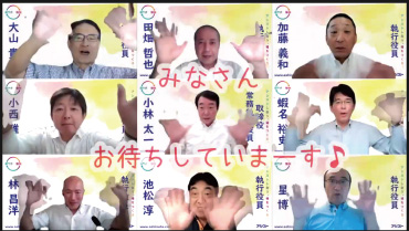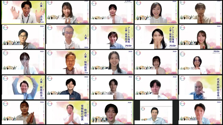 皆さんお気づきかもしれませんが、実は背景を揃えているんですよ!つながりを作るには一体感が必要!ということで、内定者&列席者用にお揃いの背景が用意されました。確かに同じ場所にいるような雰囲気が出ていますね!