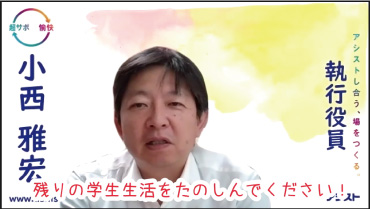 アシストは、来年で創業50周年を迎えます。変化の激しい時代にあたり、100年目を迎えるためには、変化に対応するだけではなく、自分達が変化を作っていかなくてはいけません。記念すべき50周年に入社する皆さんが、その変化を起こしてくれると信じ、期待しています。一緒に次代のアシストを作っていきましょう!
