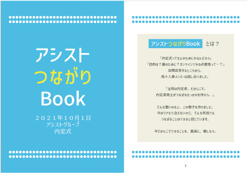 今回は、内定式の前に「アシストつながりBook」を、内定者および列席者の自宅に郵送しました。「アシストつながりBook」は、内定者の写真と自己紹介をまとめた冊子です。オンラインであっても、内定者同士がより理解を深められるよう、内定式当日は冊子を手元におき、適宜見てもらうようにしました!