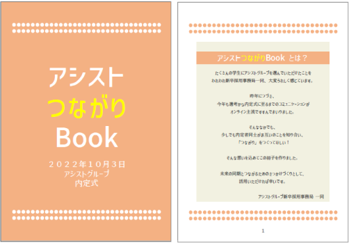 今年度も引き続き、「アシストつながりBook」が参列者の皆さんに配布されました。「アシストつながりBook」は、内定者の写真と自己紹介をまとめた冊子です。参列者の皆さんには、感染リスク軽減のためマスク着用で列席いただいていますが、一方で顔や表情が見えにくいといった課題もあります。そのため、内定者同士がより理解を深める補助ツールとして、自己紹介冊子を手元にお配りしました。内定者スピーチの際などに、つながりBookを手に発表者を見比べている参列者が多くみられました。