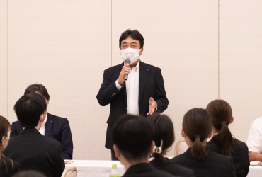 次に、アシスト北海道 代表取締役社長 高木さんよりご挨拶いただきました。高木さんからは、アシスト北海道の価値や今後のアシスト北海道の可能性への挑戦についてお話いただきました。また、内定者の皆さんへの温かいメッセージも送られました。「コロナのまっただ中の学生生活は困難の連続だったり、理不尽なこともあったかと思います。でも全てが皆さんの糧になっています。無駄なものだと思わず、誇りに思ってください。会社は個性の集まりです。皆さんの経験をアシストグループに注入していただき、さらに盛り上げていきましょう。また、就職は一種の独立です。皆さんがこの場にあるのは、家族あってのこと。何か感じたものがあれば、内定式が終わった後にでも、ご家族に『ありがとう』と一言伝えてください。きっと、喜んでもらえるのではないでしょうか」。