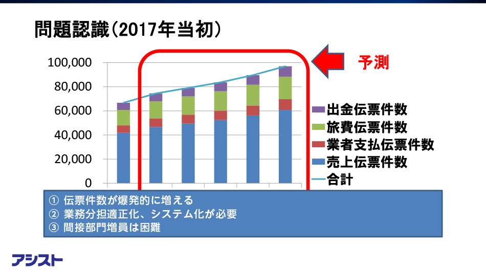 小牧:以前、「経理業務のデジタイゼーションの取り組み」と題して社外向けセミナーで発表した内容に課題をまとめているので、この資料を使って説明します。経営管理部として、経営企画課5名、経理課9名という体制で業務に取り組んでいましたが、売上や社員数の伸長に伴って伝票件数が増加し、業務負担も増加してきました。このような状況でも体制強化(増員)は難しく、限られた人数で業務を遂行していくためには業務分担の適正化とシステム化が必要になると考えていました。試行錯誤していた中で最終的には今回のNEXISプロジェクト(基幹システムの刷新プロジェクト)で対応することになった、ということが背景です。