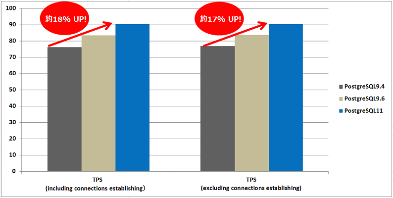 上記検証結果より、PostgreSQL9.4と PostgreSQL9.6では 約9%、PostgreSQL9.6と PostgreSQL11では 約7% TPSが増加しており、PostgreSQL9.4と PostgreSQL11を比較すると TPS(including connections establishing)は 約18%、TPS(excluding connections establishing)は 約17%多くなっていることが確認できました。