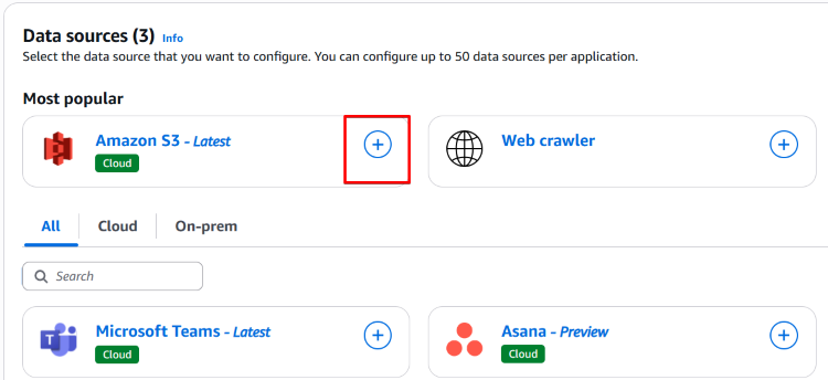 1.AWSマネージメントコンソールにログインし、Amazon Q Businessの画面にて、データソースを設定したいアプリケーションを一覧から選択します。