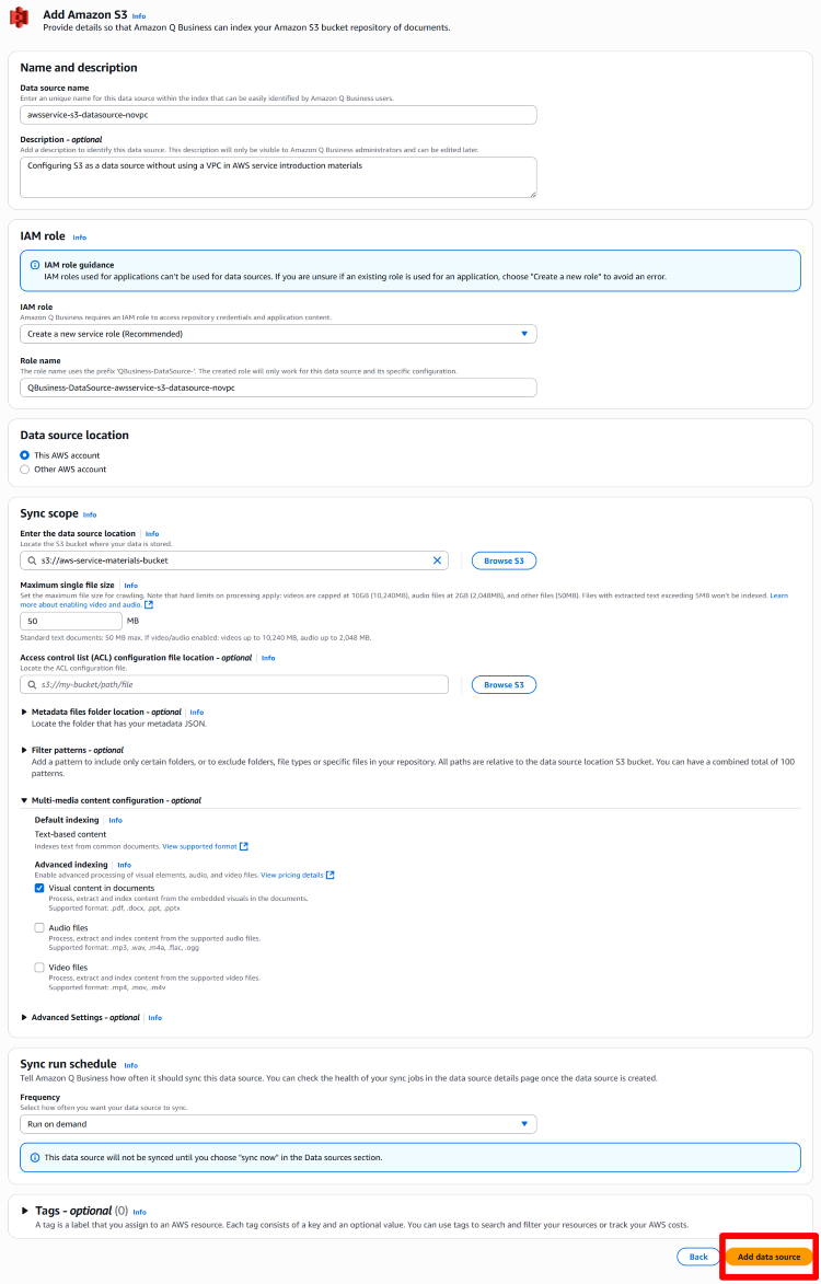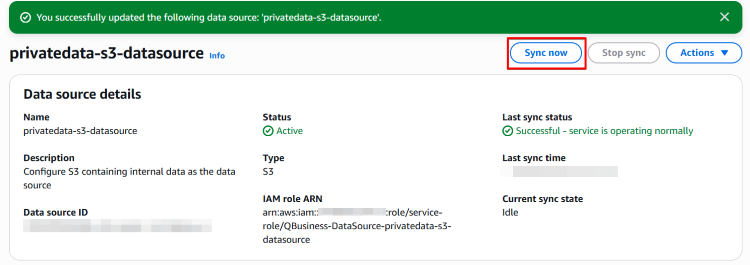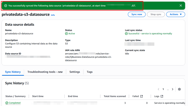 ※ここからの手順1〜6は、Amazon Q Businessのデータソース設定を変更できる管理者用のユーザーで実施します。