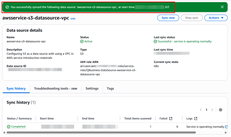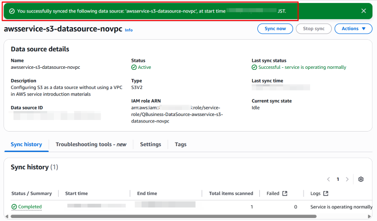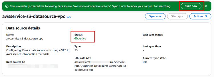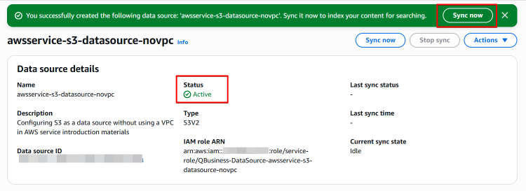 5.データソースが作成され、StatusがActiveとなったことを確認したら、画面上部の「Sync now」をクリックします。