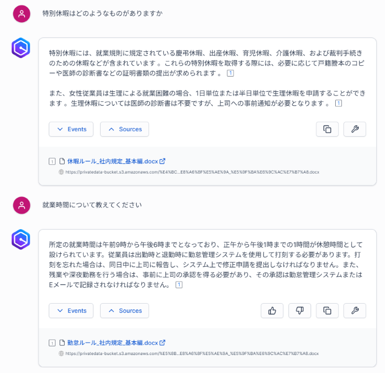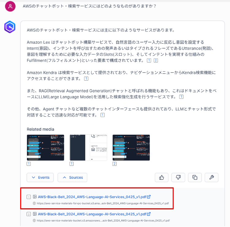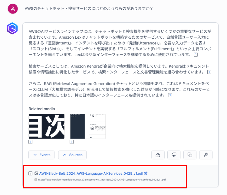 また、回答のソースがデータソース設定で選択したS3バケットに配置された資料であることが確認できました。