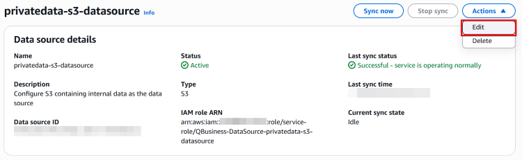 2.Amazon Q Businessのデータソース設定のActions > Edit から設定内容を変更します。