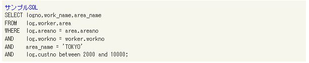 実際に自動再最適化の動作例を確認してみます。ここではLOG表(顧客のログ情報 200万行)とWORKER表(ログの登録者情報 2,000行)、AREA表(地域情報300行)の3つを結合し、AREA表から地域がTOKYOで、顧客番号2000~10000を検索するといったシンプルなSQLを使用します。