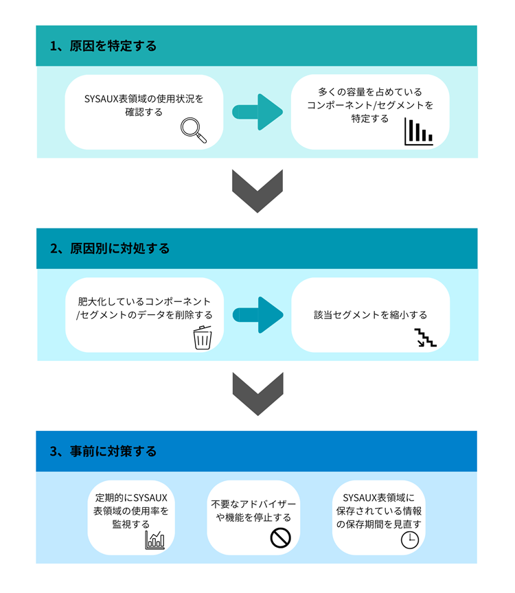 SYSAUX表領域が肥大化した際の対応フローは、大きく次の3つのステップに分けられます。