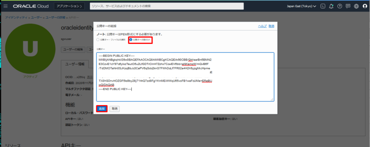 Storage Gatewayを利用するためには、Oracle CloudのユーザーへAPIキーの登録をする必要があります。