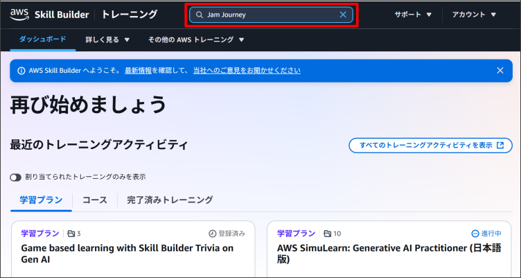 1. AWS Skill Builderのダッシュボード画面にアクセスし、画面上部の検索窓に「Jam Journey」と入力します。
