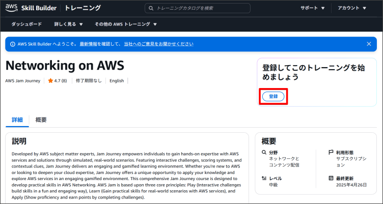 3.表示されたトレーニングからチャレンジしたいJam Journeyを選択し、遷移したページの「登録」をクリックします。
