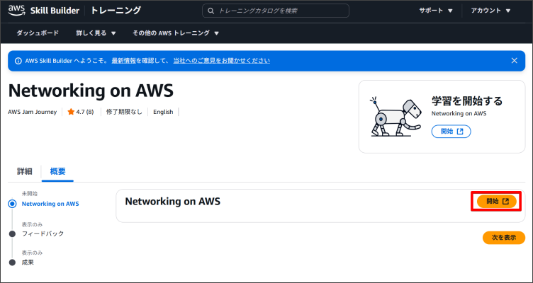 7.Skill Builderのコンソールに戻り、再度「開始」を選択します。