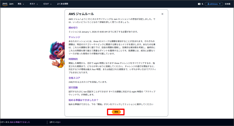 8.AWSジャムルールが表示されるので画面下部の「開始」を選択します。