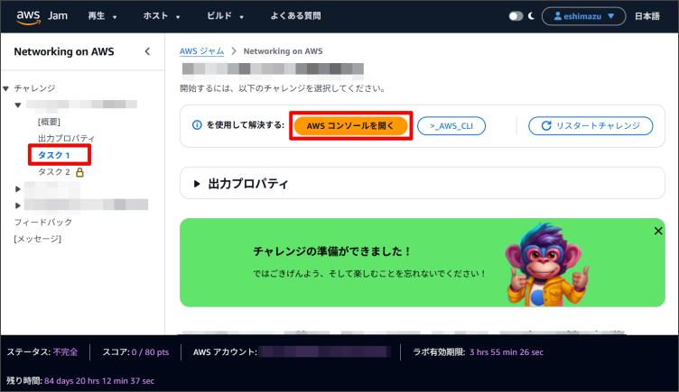 12.「AWSコンソールを開く」ボタンをクリックするとJam用のAWSアカウントに遷移します。この環境に対して操作を実施します。