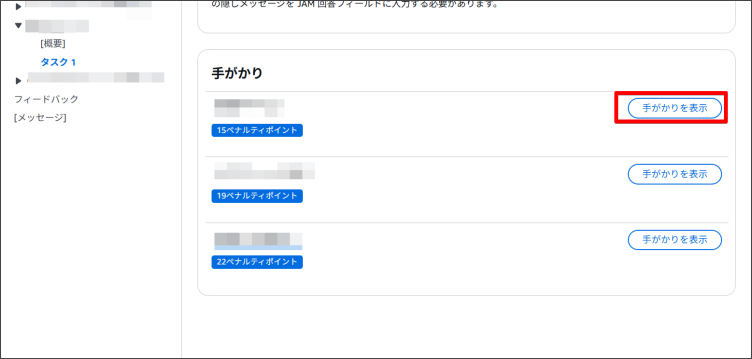 また、複数手がかりが用意されている場合、一番丁寧な解説を開くためにはその前の手がかり全てを順に開く必要があります。