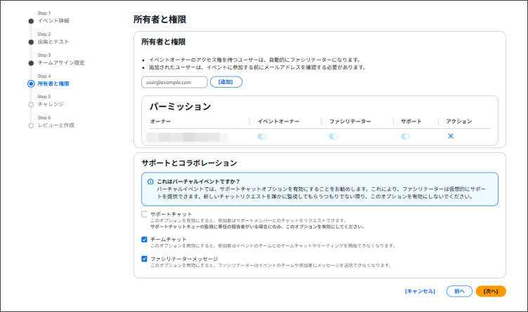 ● 所有者と権限:イベントの運営を行うメンバーを入力します。