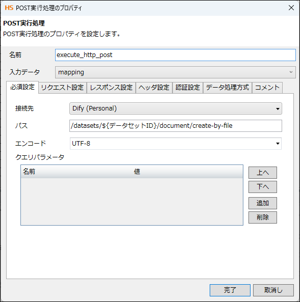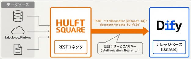 - HULFT Square(RESTコネクター)→ Dify API(/v1/datasets/{dataset_id}/document/create-by-file)