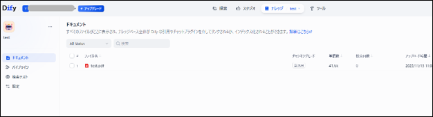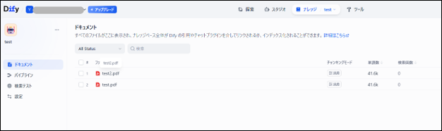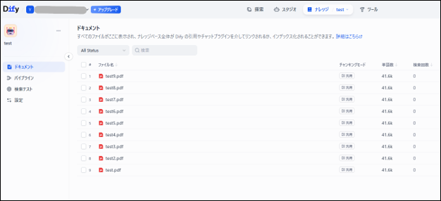 正常終了後、DifyのDataset画面で対象ファイルがドキュメントとして登録されているか確認