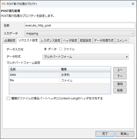 ファイルパス→fileパート、JSON文字列→dataパートへ割り当て