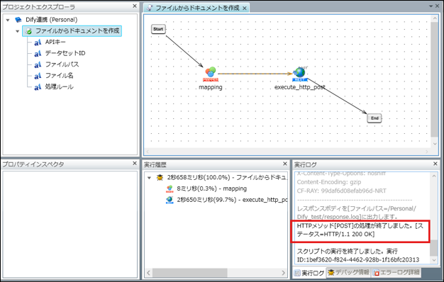 - HULFT SquareのRESTコネクタでは、ナレッジベースへのファイル格納API以外にもDifyのワークフローを制御するAPIの実行も可能です。