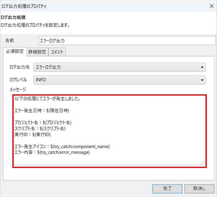 注目していただきたいのは、メッセージの部分です。出力するメッセージには、エラー時に知りたい情報を設定することができます。