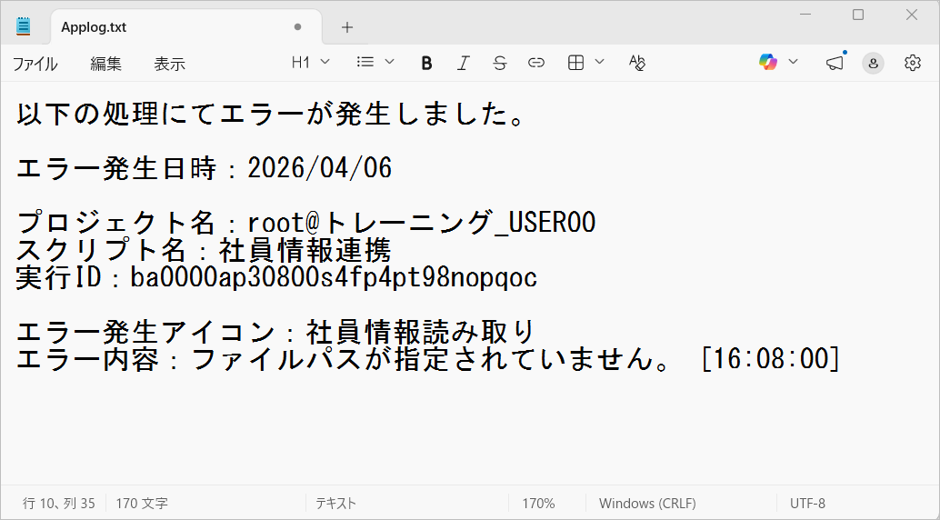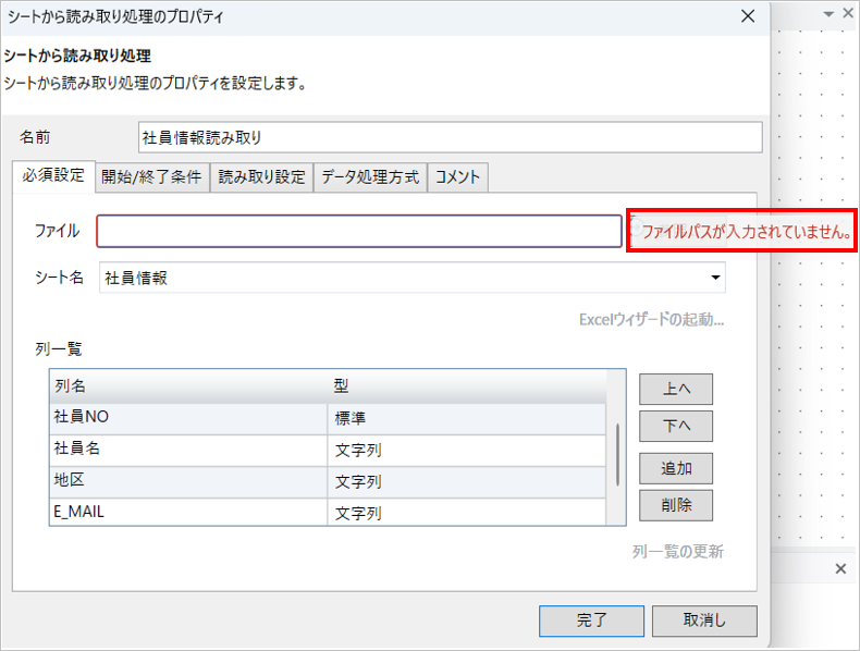 エラー時の挙動を確認するために、「社員情報読み取り」アイコンでファイルパスを指定せず、意図的にエラーを発生させてみます。
