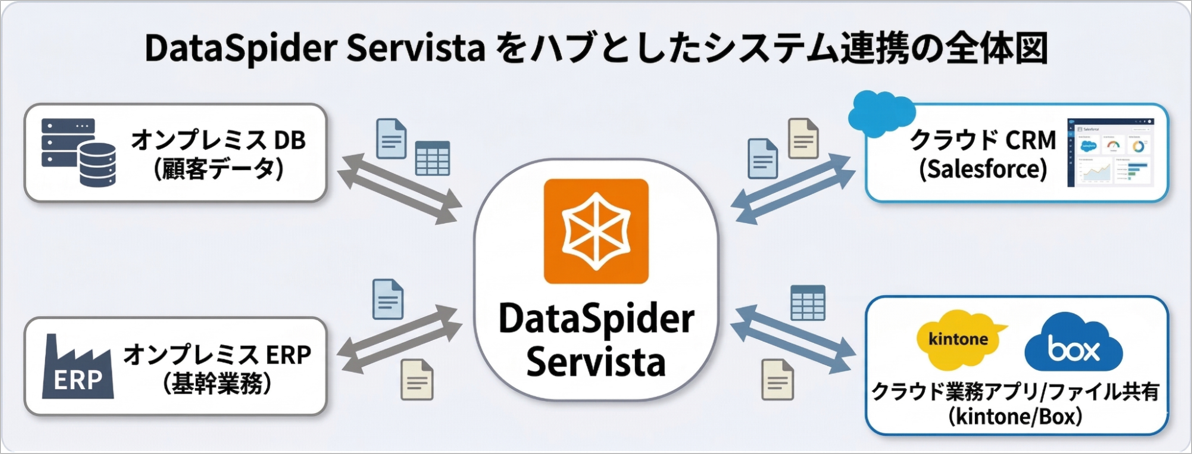ファイル、データベース、クラウドサービス(Salesforceやkintoneなど)など、あらゆる場所にあるデータを「つなぐ」製品です。