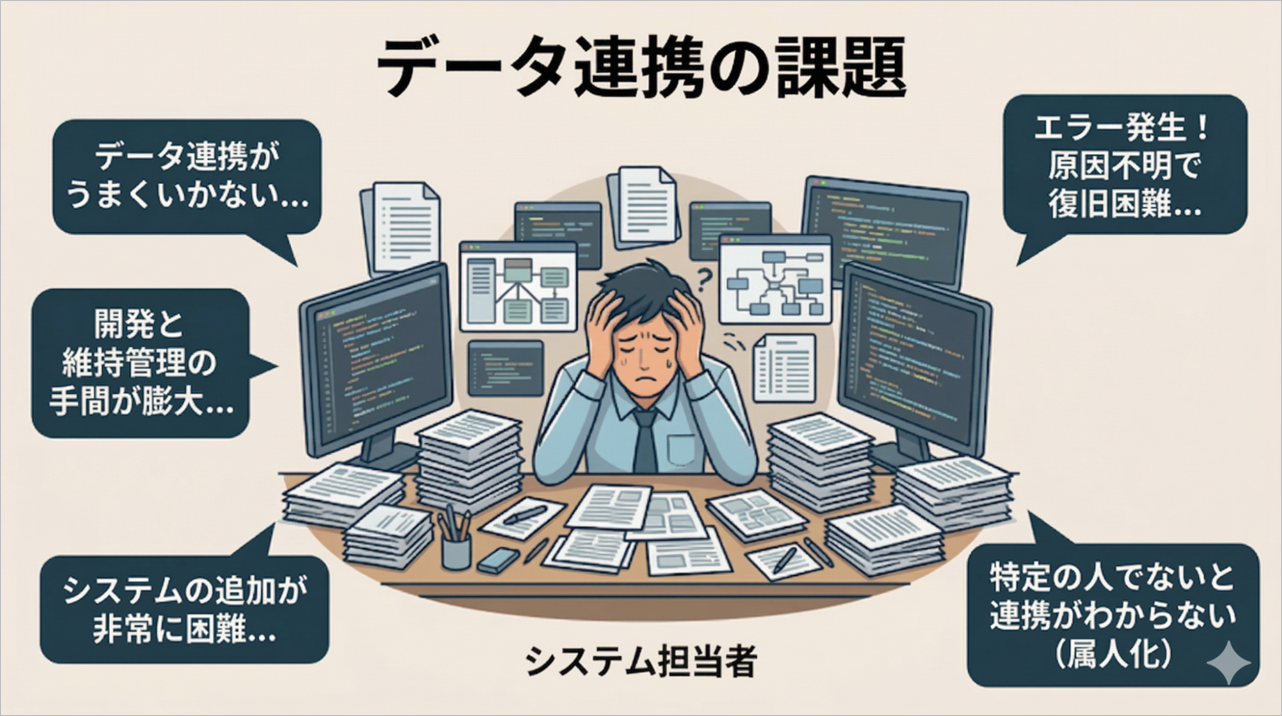 また、このシステムを連携しようとすると、人が手作業でExcelなどに書き出して、もう一方のシステムに打ち直すといった作業や、システムごとに専用の連携プログラムを、時間をかけて開発する必要があります。