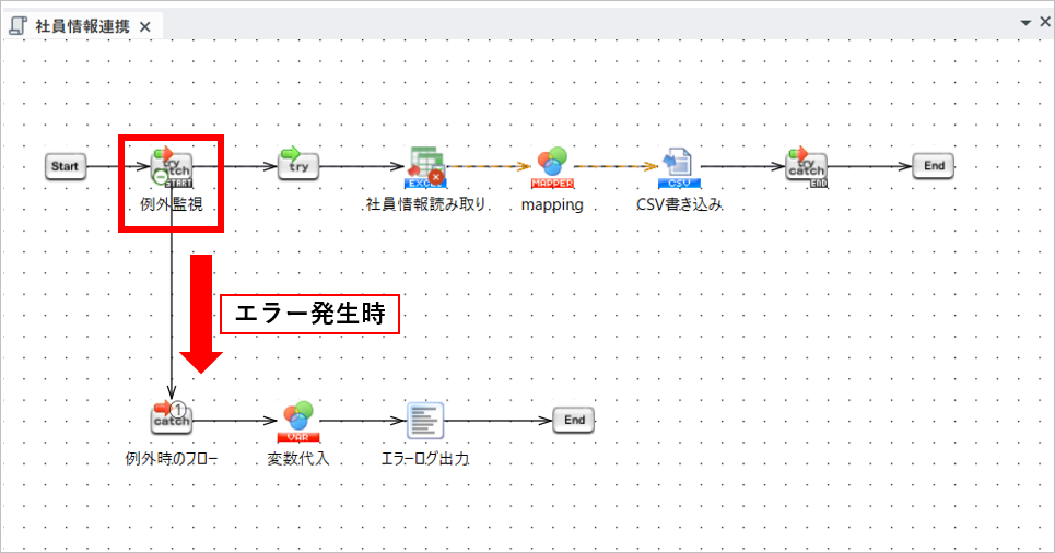 DataSpiderの例外監視アイコンを使えば、もしエラーが起きても、自動的に「エラー専用のルート」へ処理を流すことができます。