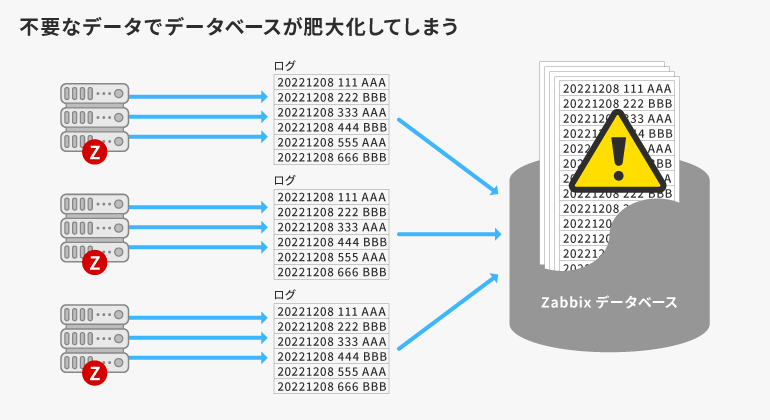 → 全ログを収集するため、Zabbixサーバーのディスクを圧迫するリスクあり。
