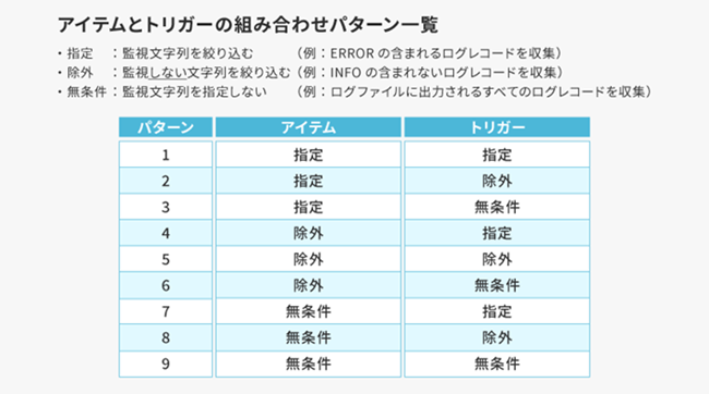 以下に、一般的な収集・検知設定のパターン例を示します。可能な限り、パターン1のようにアイテムとトリガーの両方で監視文字列を指定し、対象ログを絞り込む構成を推奨しています。