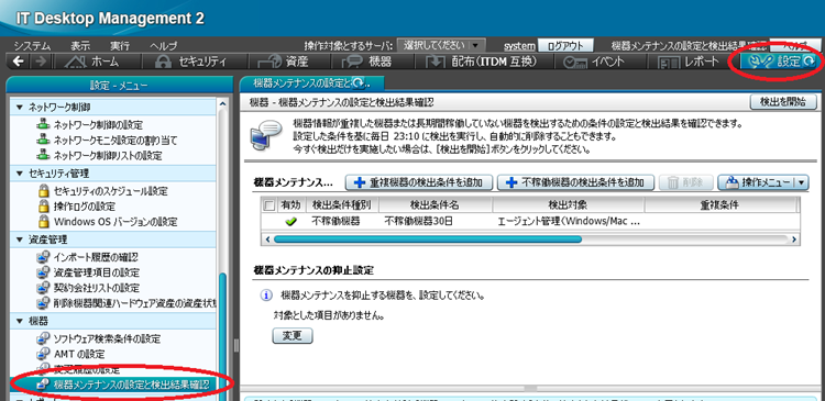 JP1/ITDM2では、一定期間情報が更新されていないエージェント(管理対象機器)を自動で検出する「機器の自動メンテナンス機能」があります。したがって、以下の手順で不稼働機器を検出しましょう。