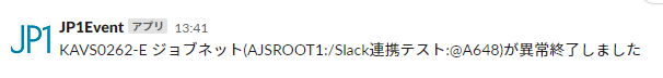上記設定によりジョブネットエラーのJP1イベント発行時にコマンドが実行され、Slack、Google Chatへメッセージが通知されます。