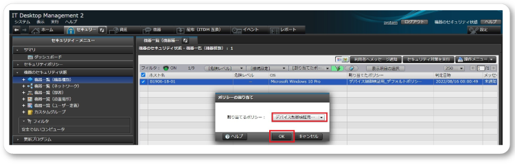 2.[ポリシーの割り当て]画面にてプルダウンを開き、適用したいセキュリティポリシーを選択し、[OK]ボタンを