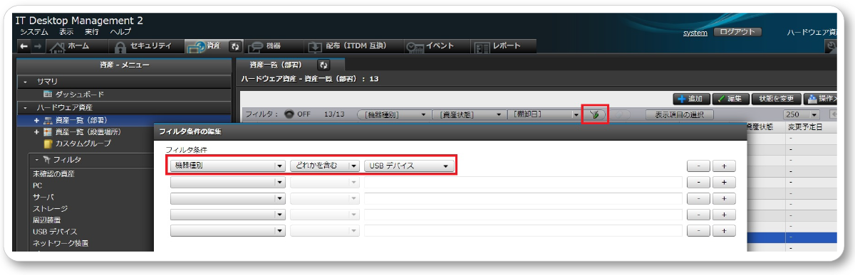 [登録済みのUSBデバイスの使用を許可する]の機能が有効となる資産は、[機器種別]が「USBデバイス」