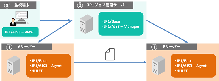 ①HULFTがインストールされているサーバーに、JP1/AJS3 - Agent(またはManager)を導入します。