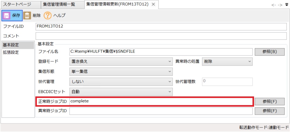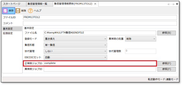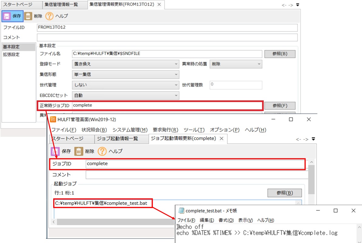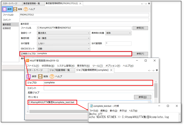 ジョブID:「complete」のジョブ起動情報には空のフラグファイル(complete.log)が作成するバッチを設定