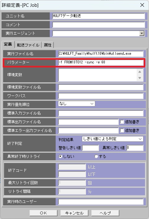 JP1からHULFTの配信・送信コマンド(utlsend / utlrecv)を実行する際は、-sync(同期転送)と-w(タイムアウト時間)の設定が必須です。