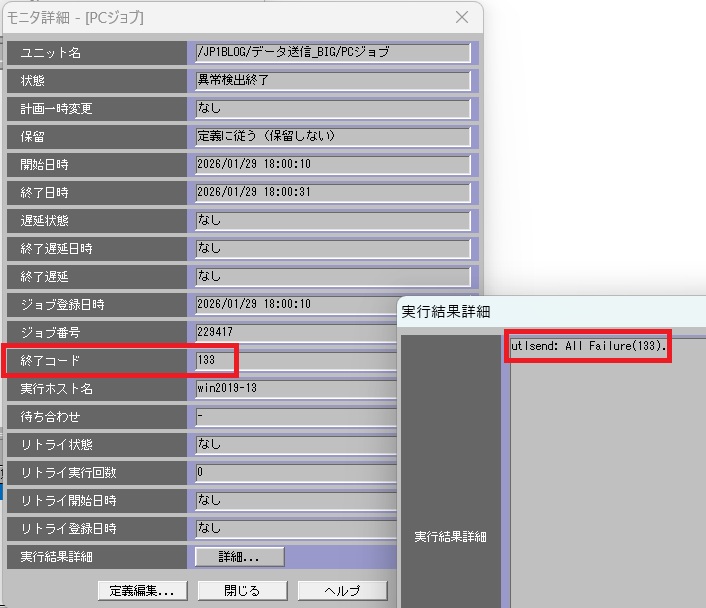 HULFTのファイル配信ジョブが異常終了した場合、JP1/AJS3 では実行したコマンド(utlsend / utlrecv)の終了コードが確認できます。詳細な原因については JP1/AJS3 ではわからないため、HULFTの管理画面を確認する必要があります。