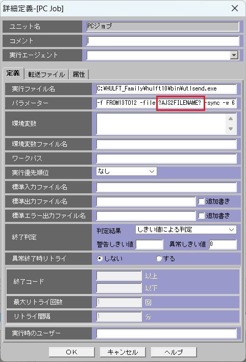 3.後続のジョブにて、HULFTの配信コマンド(utlsend)の引数にそのファイル名を指定し、転送を実行します。