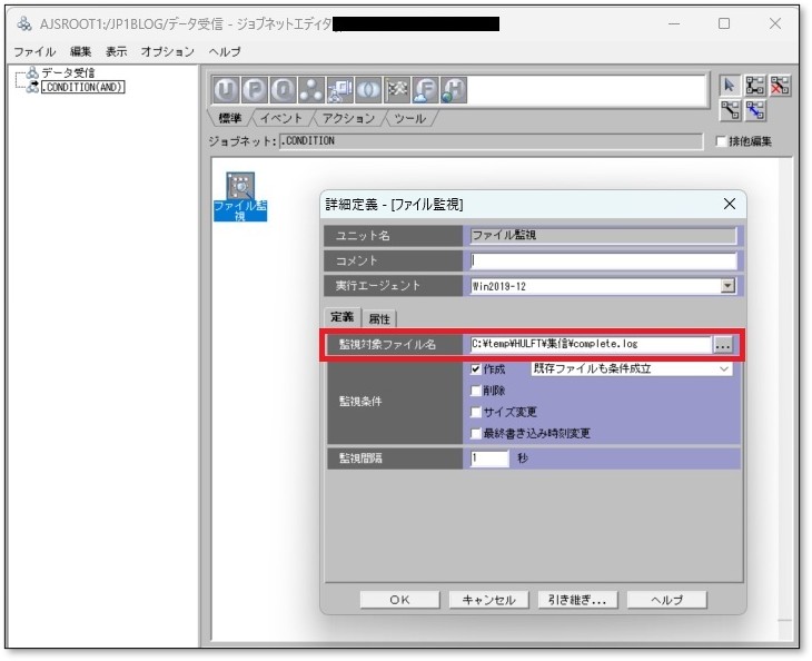 1のフラグファイルの作成を監視するファイル監視ジョブを設定します。