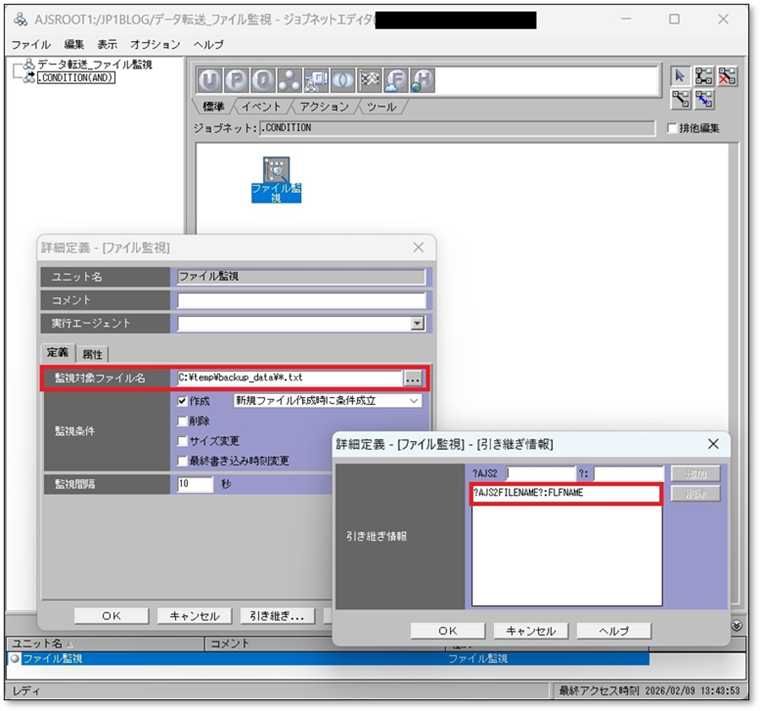 JP1/AJS3 でファイル生成を監視する「ファイル監視ジョブ」を設定します。また、後続ジョブへ作成されたファイル名を渡すため、引き継ぎ情報を設定します。