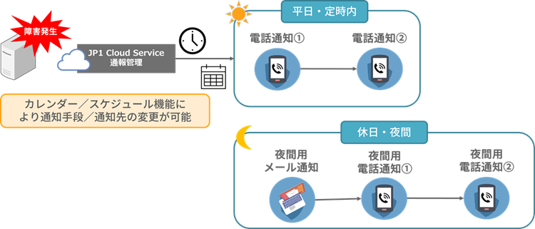 夜間・休日と日中とで、担当者が変わることもあるかと思います。JP1 CS 通報管理は、曜日や時間帯に応じた通知手段と通知先の自動切り替えや、通知の停止/再開を簡単に行えるため、柔軟な通知運用ができます。