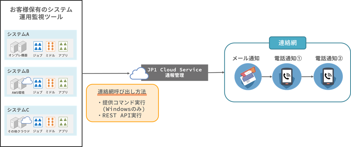 REST APIによる通知が可能なので、JP1以外の既存の監視システムと本サービスを連携することも可能です。