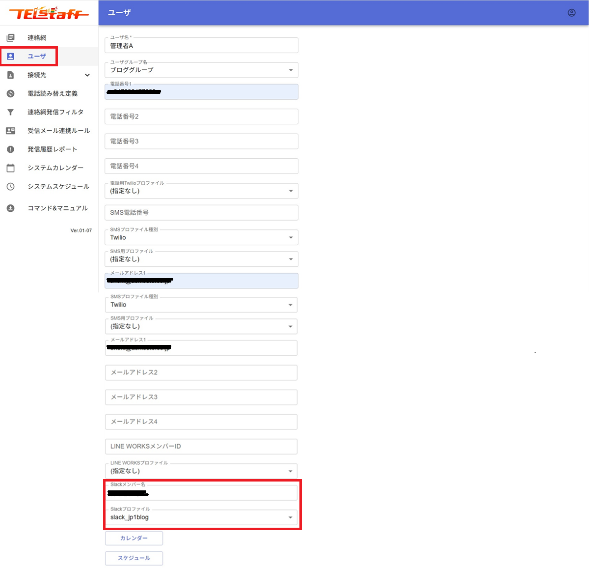 通報管理サービスの[ユーザ]の画面で、ユーザと連絡方法をユーザ情報として登録します。ユーザ情報には、Slackを登録する場合は、「Slackメンバー名」と連絡先で登録した「Slackプロファイル名」を設定します。