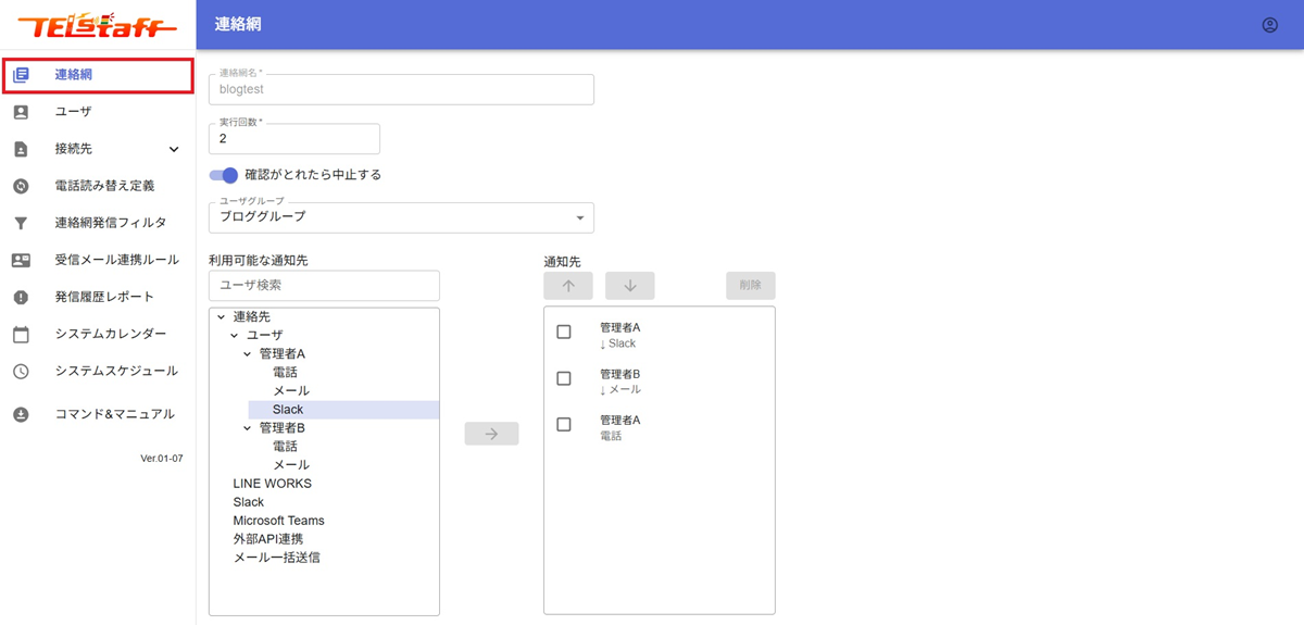 連絡網には、繰り返し通知(実行回数)を設定できます。電話通知で、連絡先の相手が電話に出なかったり、一時的な電波障害などでつながらなかった場合でも繰り返し通知されます。